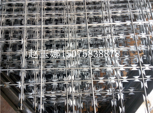 刀刺隔離網(wǎng)墻工藝:它采用鋼板(刀板)沖壓成型包附于熱鍍鋅鋼絲(芯線)之上,由銳利尖角鍍鋅鋼板或不銹鋼薄板做刀片,高張力鋼絲做芯線組合而成的。