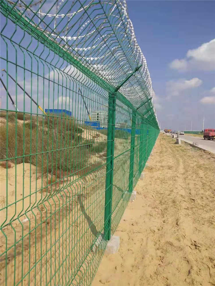 機場護欄網(wǎng)選用優(yōu)質低碳鋼絲編制焊接而成,具有美觀、實用、方便運輸和安裝的特點。在機場護欄網(wǎng)的橫向加裝四道折彎加強筋,在整體成本增加不多的同時,使網(wǎng)面強度和美感顯著增加。